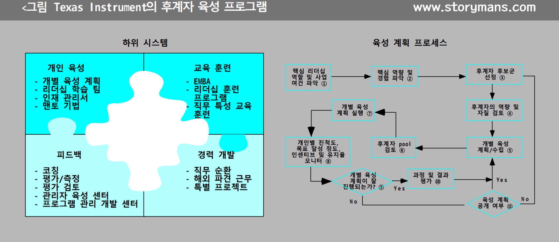 Texas Instrument의 후계자 양성 프로그램은 몇 가지의 하위 시스템으로 구성된다(<그림> 참조). 예컨대 개인 발전을 위한 시스템, 피드백 시스템, 교육훈련 시스템, 그리고 경력 개발 계획 등이 대표적인 하위 시스템이다. 특히 후계자 양성 프로그램이 성공적으로 운영되기 위해서는 각 부문이 제 역할을 수행하는 것이 중요하다고 보고, 각 부문의 세부 역할과 책임을 구체적으로 설정하고 있다. 예를 들어 인사 부문 관리자는 향후 사업 운영에 필요한 후계자 풀을 설정하는 작업을 지원하며, 최고경영진이 후계자 풀에 대한 개발 촉진 활동을 제대로 할 수 있도록 다양한 정보를 제공하는 역할을 한다.